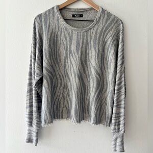 Stylish gray striped top. Features a round neckline. Perfect for casual wear.