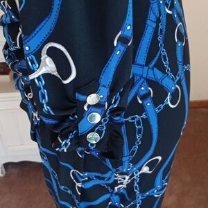 Equestrian graphics define this dress. Wrap front, goldtone hardware. Buttons at tabbed sleeve. Drape at waist gathered by gold buckle, faux wrap skirt with tucked pleats. So flattering. Size 6 measures 36 at chest, 30 at waist, 40 at hips, 36 at bottom hem for a perfect pencil shape. This is a beauty.