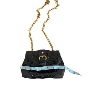 Sleek black patent leather with embossed design. Features a striking gold chain. Perfect for adding elegance to any outfit.