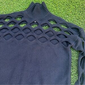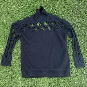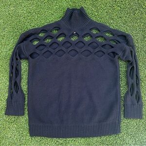 The Diotima Albion knit sweater features intarsia cutout details through the arms and upper chest. It has a mock neckline, long sleeves, and an oversized fit. This pullover style sweater is made from a wool blend and can be dry cleaned