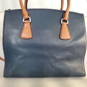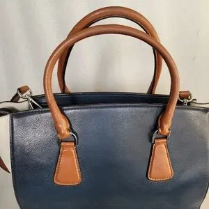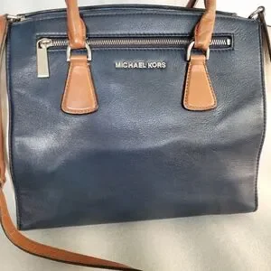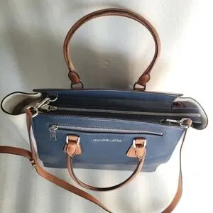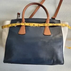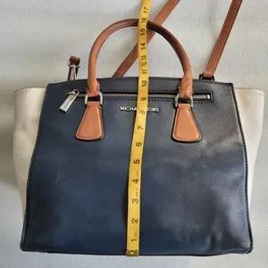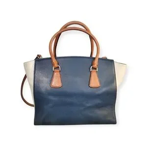Gorgeous large Michael Kors genuine leather SOPHIE satchel in blue, white and brown colorblock design. Stylish and versatile design