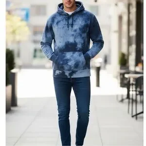 Cozy light and dark blue tie-dye hoodie with drawstring. Features Hollister logo.