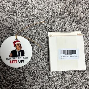 Round ornament featuring a humorous design with a Santa hat. Perfect for holiday decor. You Tree Just Got Litt Up Ornament - Litt Up Ornament - Louis Litt - Harvey Specter - Suits Inspired Ornament - Novelty Gift - Suits Tv Show Inspired - Suits Tv Show Quote Printed on Both Sides