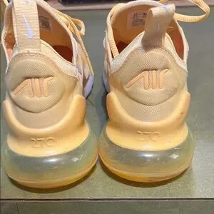 Vibrant Nike Air Max 270 with yellow upper and orange details. Features a cushioned sole for comfort.