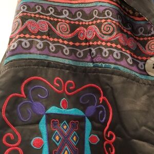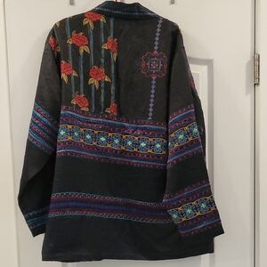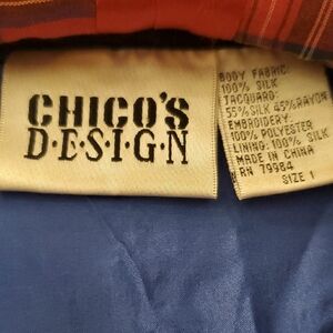 Funky 100% silk jacket by Chico's. Features rich blue and red tones. Perfect for stylish layering.