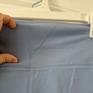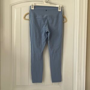 Comfortable and stylish Athleta transcend leggings, light blue (I think these are Heron), size M. These are the 7/8 length. Some minor wear on pants and waistband. Has V mark on waistband that may be creasing from storage and may come out in wash. Perfect for workouts or casual wear. Soft fabric with a sleek fit. Smoke free, dog friendly home.