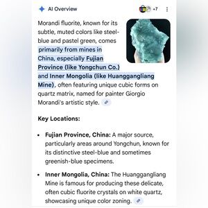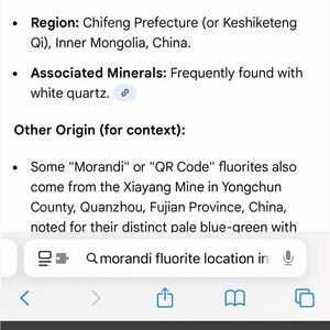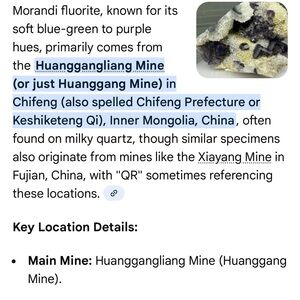 See you last picture for alternate nickname. This type of fluorite from this area, which has that beautiful dark blue purple color that resembles Tanzanite has the nickname “Tanzanite fluorite.” These are very sought after and rare. Their lighter counter points are called Morandi . Both are from mines and in Mongolia, China.