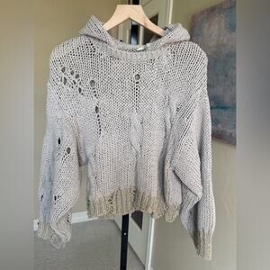 MOTH Anthropologie Chunky Knit Cropped Hoodie Sweater Gray Gold Hem Womens Small