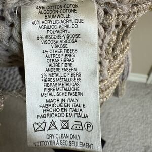 Cozy and stylish chunky knit pullover sweater by MOTH for Anthropologie. Crafted in Italy with a soft cotton blend, this sweater features a relaxed drop-shoulder silhouette and cropped cut. Designed in light gray with metallic gold trim at the cuffs and hem for a subtle shimmer. Distressed-style open knit with intentional variation adds to its unique, boho look.