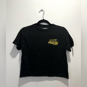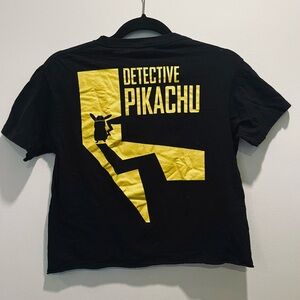 Pokemon Black and Yellow Cropped T shirt from Hot Topic in GUC, wome wear to the iron on design on the back (see last photo for details), Women's size Small. This black cropped tee features "Detective Pikachu" in a spray paint-inspired design on the left chest and a Detective Pikachu silhouette on the back