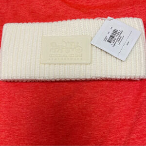 Elegant Coach headband in ivory. Soft knit design with signature logo patch. Ideal for chic winter style.