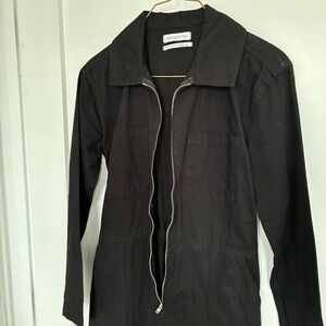 Black 100% cotton jumpsuit. Front zipper. 2 chest pockets and 2 waist pockets. Elastic in back of waist band.