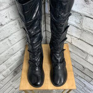 Miz Mooz Bloom Boots 8 Black Distressed Leather Wedge Heel Knee High Side Zip