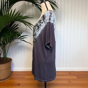 Stand out in this edgy Vocal USA short sleeve top featuring a gray & white tie-dye pattern with bold rhinestone cross and filigree designs on front and back. Lightweight with a relaxed fit and stretch. Made in Los Angeles.