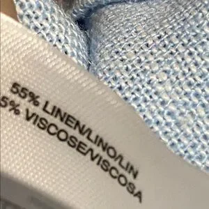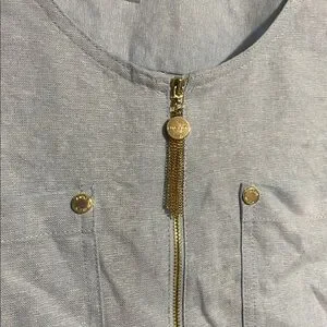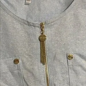 Linen viscose tunic top - shirttail hem with slits. Gold tone chain tassel zipper front pull has some marks on pull hardly noticeable . Button tab sleeves to shorten. Pockets in front. Approximate Measurements Laying flat: pit to pit 22” - shoulder to hem 28” - sleeves 16” . Preowned good used condition please check all pictures.