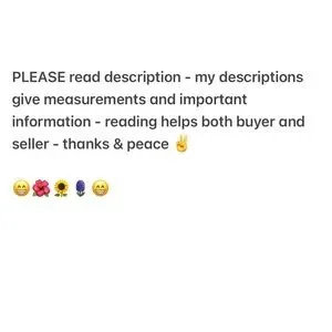I sell clean preowned used items not new & not perfect can be linty so wash first. I do check clothes carefully but could miss issue just let me know. I do not dry clean my price reflects that. I ship same or next day. I am not responsible for USPS delays. I sell lower because I use no frills packing to protect items. If you have hesitation buying please ask questions - if still unsure please don't purchase. I don't mean to disappoint and take survey comments and rating seriously as I am a 5 star gold seller ✌️.