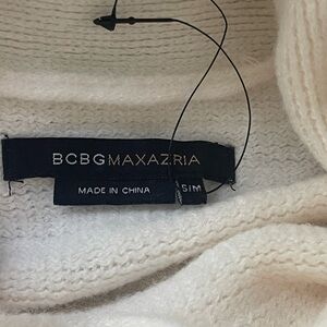 Embrace warmth and style with this BCBGMaxAzria cream shrug sweater, featuring a chunky knit texture and a relaxed fit. The asymmetrical hemline and wide sleeves add a modern touch, making it perfect for layering on cooler days. Crafted from a thick, cozy material, this sweater ensures both comfort and elegance.