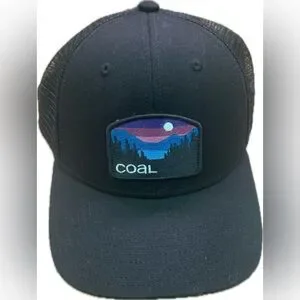 Black trucker hat featuring a colorful mountain patch. Perfect for outdoor adventures.