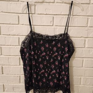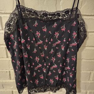 Set of two lace camisoles. One in solid red. One in black with floral pattern. Delicate lace detailing. Black is M and red is S.