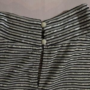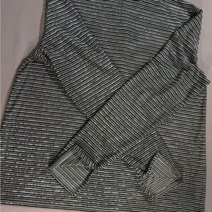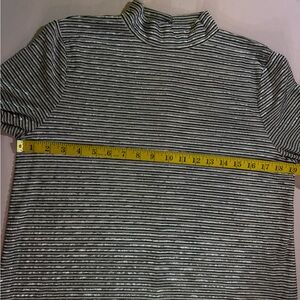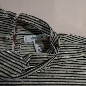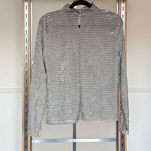 Chic and versatile long sleeve top from Nine West featuring a classic black and white striped pattern with a subtle shimmer finish. Designed with a mock neckline and a flattering fitted shape, making it perfect for work, casual wear, or layering.