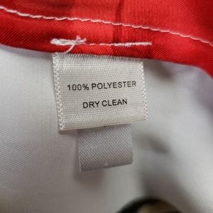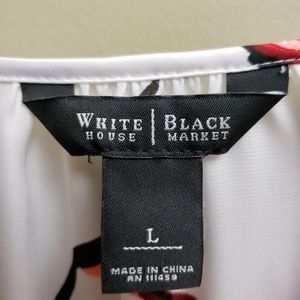 Elegant blouse with bold floral print. Features red and black flowers on a white background. Buttoned front and elastic cuffs.