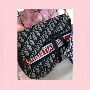 Stylish clutch with iconic monogram design. Features a bold red stripe accent.