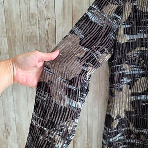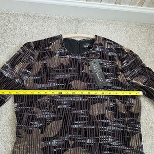 This is a new with tags Ellen Tracy dress, size 6. The dress features a chocolate color with a unique pattern. It has long sleeves and a round neckline. The dress is fully lined and has a concealed back zipper. The material appears to be a blend of polyester and spandex. The dress is in excellent condition with no visible imperfections.