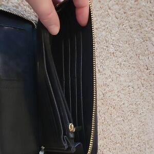 Elegant black wallet. Features gold accents. Includes wrist strap.
