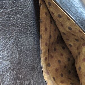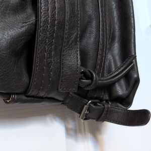 Brown crossbody with adjustable strap, interior pouches and zipper pocket with three exterior pockets, one zipper. 9.5" wide and 9" tall.