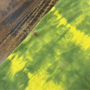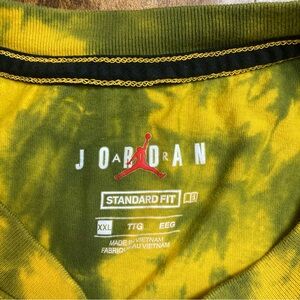 Preowned Jordan Jump Man shirt. Yellow front graphics on a yellow/green shirt (tie-dye look). 100% Cotton. Size XXLarge, Standard Fit. Shirt is distressed and has some markings as show in pictures. Photos show measurements.