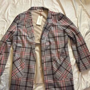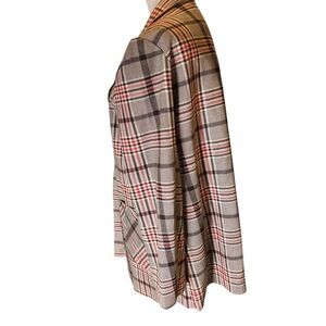 Stylish plaid Solitaire blazer jacket for women, perfect for any occasion. New-with-tag. Features a classic plaid design with a comfortable fit. Gray, red, black with two side pockets. Size XL.