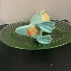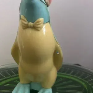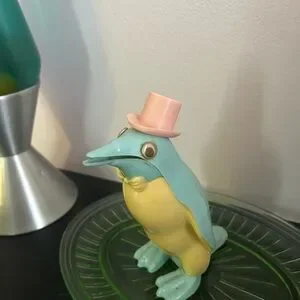 Charming penguin piggy bank wearing a pink hat. Features a light blue and yellow body. Perfect for collectors or as a unique decor piece.