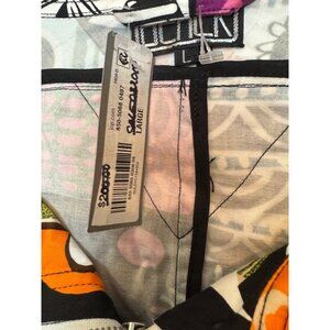 Boldly designed women's jacket with multicolor abstract fish and geometric patchwork print. Crafted with cotton and spandex for comfort. Labeled size large. Zip front with adjustable drawstrings.