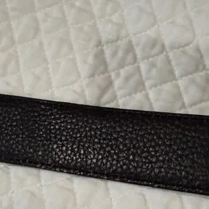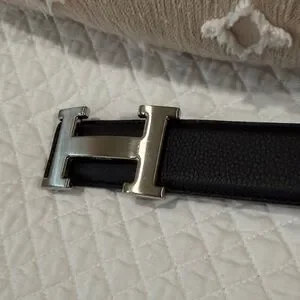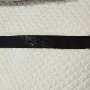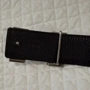 Elegant black leather belt featuring a sleek silver buckle. Perfect for adding a touch of sophistication to any outfit.