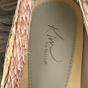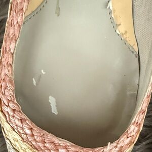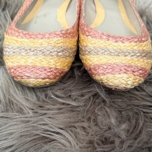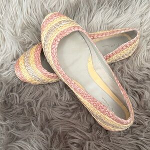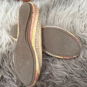 Step out in style with these chic woven flats. Featuring a delightful blend of pink and yellow, these shoes are perfect for any casual outing. Enjoy comfort and elegance with every step. Little to nowhere on the outside and and bottoms, but some on the inside souls.