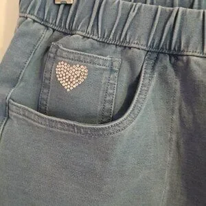 Features: comfortable stretchy knit denim fabric, elastic waist, ribbed cuffed ankles, front pockets, small heart detail over pocket, pull on style