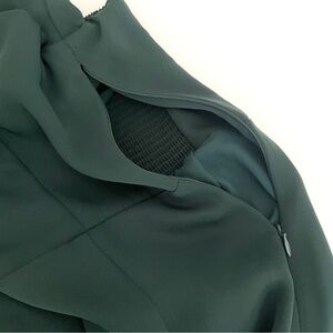 This is a long-sleeve dress with a plunging bustier-style neckline and a thigh slit. It's made from recycled, drapey, matte satin fabric.