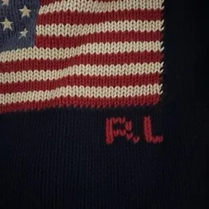 Classic navy crewneck sweater. Features American flag motif. Iconic Ralph Lauren style.