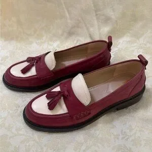 Elegant loafers with a burgundy exterior and cream accents. Features stylish tassels. Ideal for versatile wear. Size 8 in very good condition, two vey small knicks on soul as shown in pictures. Round-toe slip-on loafer flats