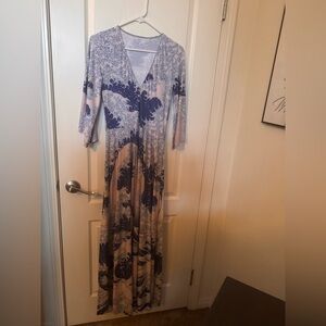 Stunning maxi dress with ocean wave design. Features flowing sleeves and a flattering fit. Ideal for making a bold fashion statement.