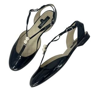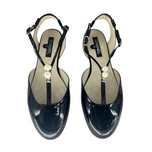 Chanel 2013 Black Patent Leather CC Pearl Slingback Flats