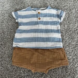 Baby boys Adorable blue & white striped shirt with wooden buttons. Paired with comfy brown shorts. Perfect for casual outings. Textured/muslin fabric. Beachy vibe.