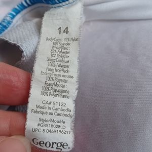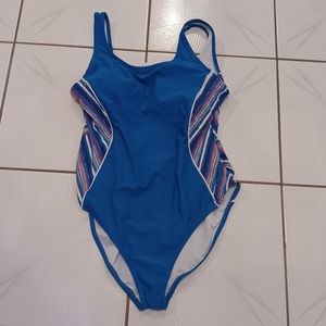 Blue 1 piece swimsuit, size 14, George, pink/blue/white/gray diagonal stripes on the sides, open back with hooked strap, inner lightly padded bralette, great condition.