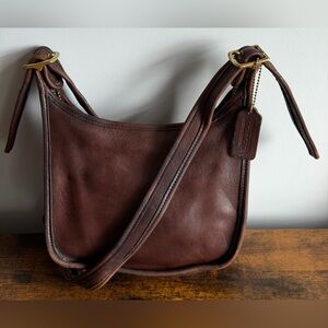 Authentic Coach vintage leather shoulder bag in rich brown. Made from high-quality genuine leather with classic Coach craftsmanship, featuring solid brass hardware and an adjustable shoulder strap. Timeless silhouette suitable for everyday wear.