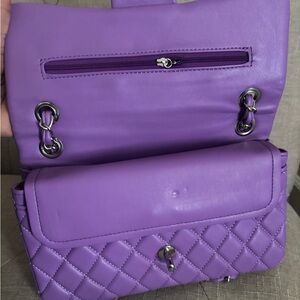 Chic Inspired quilted flap bag in lavender/lilac/purple. Features quilted design and silver-tone chain strap. Ideal for stylish outings. Inspired. One imperfection shown, not noticeable when wearing. Clean interior, I keep jewelry boxes inside to retain shape. Only worn once. Chanel