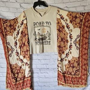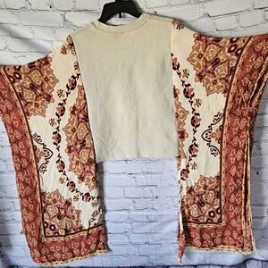 Upcycled western/boho sweatshirt poncho. Best fits sizes XS-1X. Includes armholes.