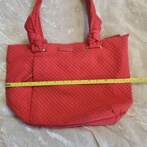 Stylish and spacious quilted tote bag in vibrant coral color. Perfect for everyday use.