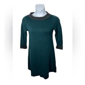 This Adrienne Vittadini sweater dress blends comfort and polish in a versatile two-tone design. Crafted in a rich green body with soft grey trim, this size Small dress features long wrist-length sleeves and a knee-length silhouette that flatters without feeling restrictive. Made from a cozy cotton, rayon, and nylon blend, it offers breathable warmth ideal for transitional weather. Easy to style for office wear, casual days, or fall and winter outfits, this dress pairs effortlessly with boots, tights, or layered accessories. In excellent preowned condition and ready to wear.