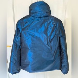 Elie Tahari blue taffeta puffer jacket. Polyester taffeta with down fill. Cropped style with 3/4 sleeves. Down baffles are inside. Bell sleeves. Pristine condition. I wore it as an evening jacket with a full midi tulle skirt but also perfect for daytime.