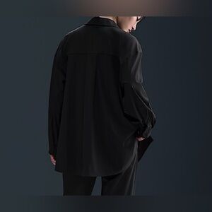 Sleek black easy snap button down shirt. Features classic collar. Perfect for versatile styling.
